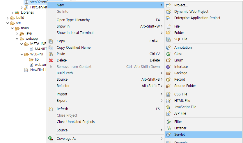 클라이언트가 어떤 요청을 하면 그 결과를 다시 전송해주는 역할을 한다. 웹 어플리케이션 서버에서 동작하는 프로그램 구현시 사용하며, Servlet은 클라이언트 요청에 따라 서버가 실행할 수 있는 유일한 자바 파일이다. Servlet API를 통해 제공받을 수 있으며, 구현을 위해서는 HttpServlet을 상속 받으면 된다.