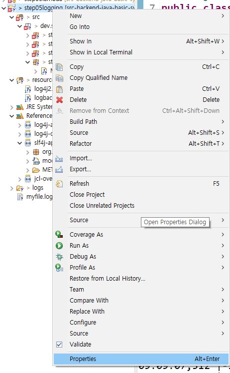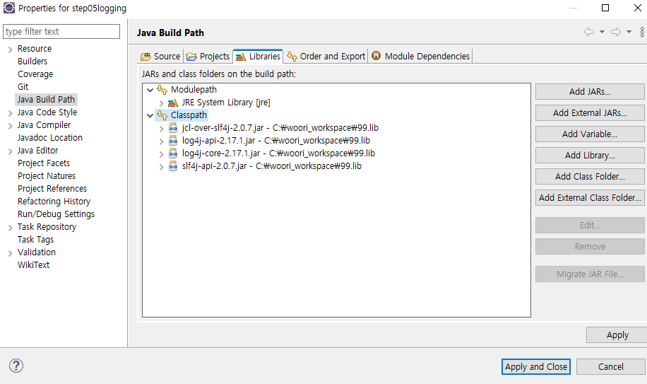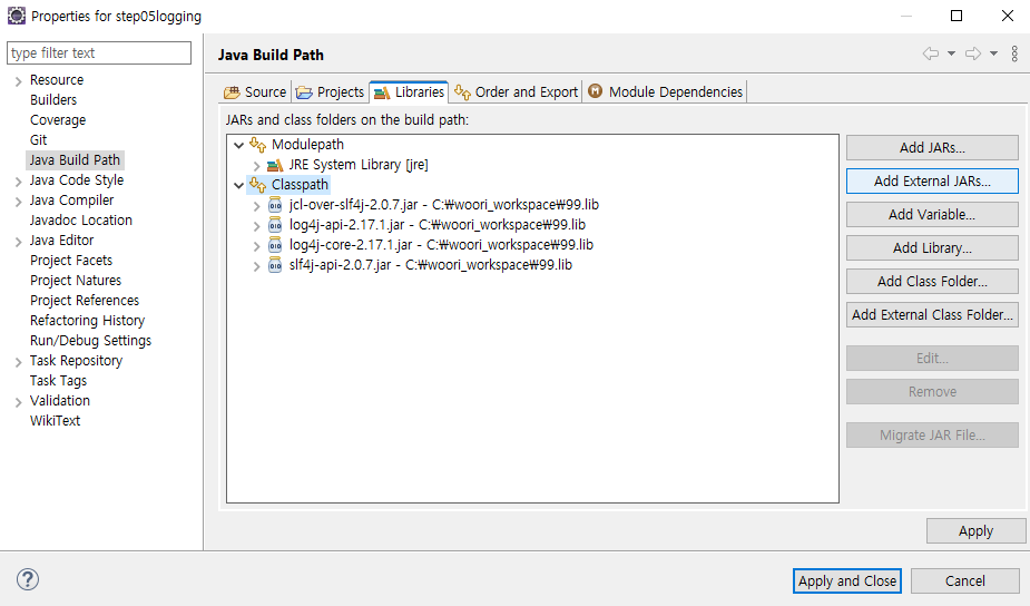 [1.10.화요일] - java logger api 사용 실습 - 디자인 패턴(Facade) - 이클립스 build path classpath로 라이브러리 추가 및 제거