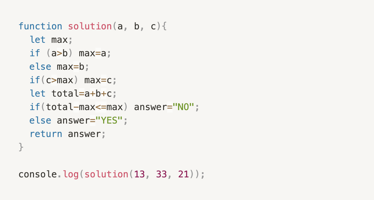 3. ๋๋จธ์ง ๋ณ ๋ ๊ฐ์ ํฉ ๋ณด๋ค max๊ฐ ์์ผ๋ฉด NO ๋ฆฌํด, ํฌ๋ฉด YES ๋ฆฌํด